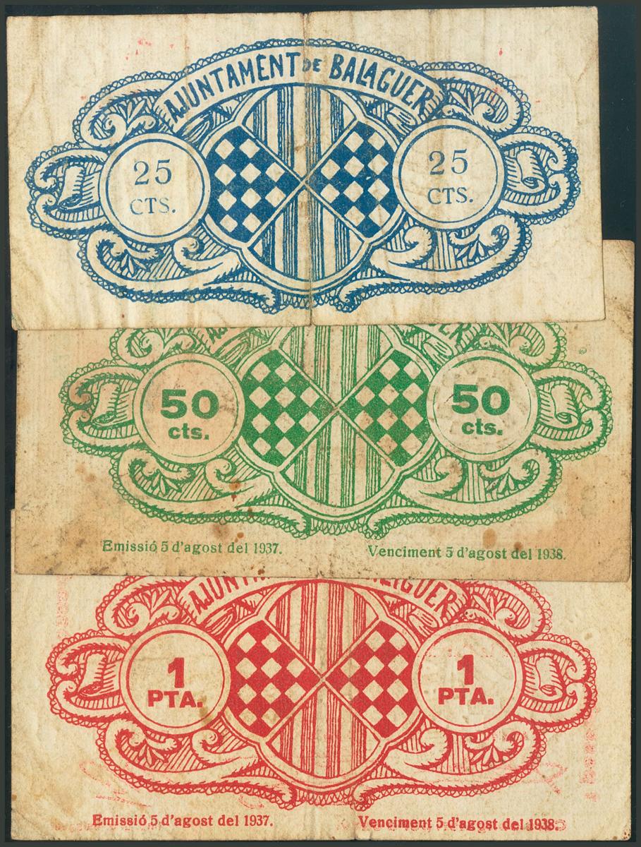 BALAGUER (LERIDA). 25 Céntimos, 50 Céntimos y 1 Peseta. 5 de Agosto de 1937. (González: 6486/88). BC.