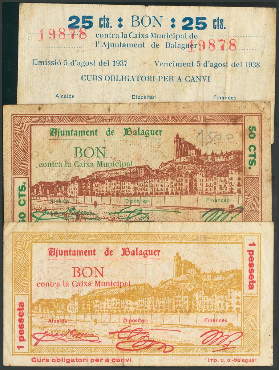 BALAGUER (LERIDA). 25 Céntimos, 50 Céntimos y 1 Peseta. 5 de Agosto de 1937. (González: 6486/88). BC.