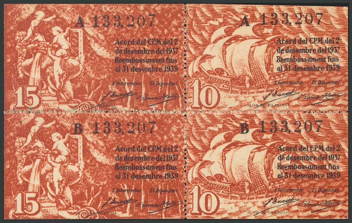 BARCELONA. 10 Céntimos (2) y 15 Céntimos (2). 2 de Diciembre de 1937. Serie A y B. Impreso en bloques de 4 billetes (dos de 10 cts y dos de 15 cts). (González: 6523/24). EBC.