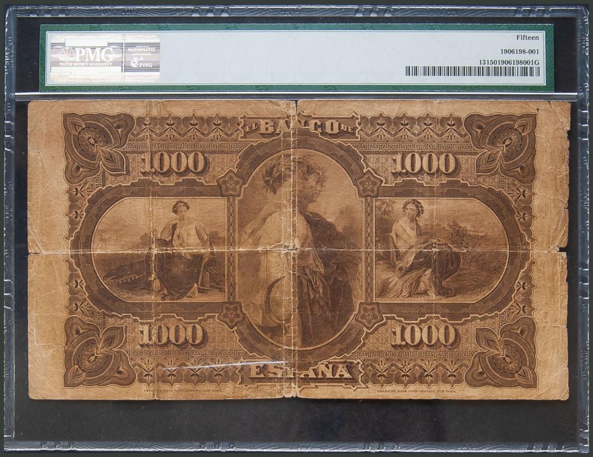 1000 Pesetas. 1 de Julio de 1876. Sin serie. Billete con las dos matrices e impreso por la American Bank Note. (Edifil 2017: 269, Filabo: 55, Ruiz Alentorn: 107, Pick: 13). Extraordinariamente raro, muy pocos ejemplares conocidos, en nuestra biblioteca sólo hemos sido capaces de localizar cuatro ejemplares. MBC. Encapsulado PMG15.