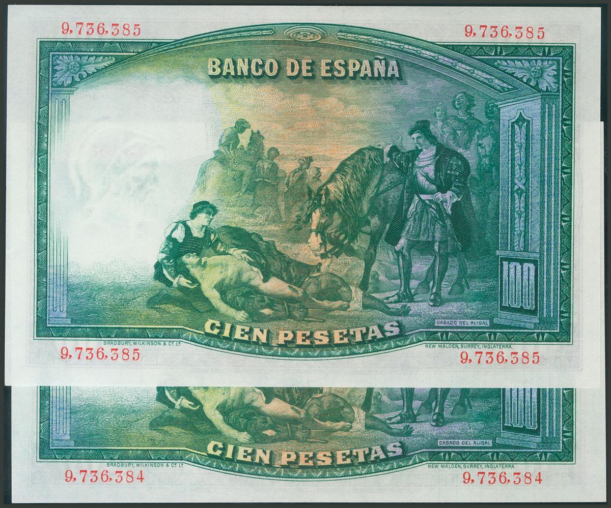 100 Pesetas. 25 de Abril de 1931. Pareja correlativa. Sin serie. (Edifil 2017: 360). Apresto original. SC.