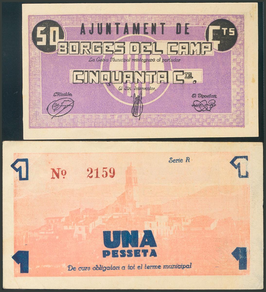 BORGES DEL CAMP (TARRAGONA). 50 Céntimos y 1 Peseta. (1938ca). Series B y A. (González: 7164/65). EBC-.
