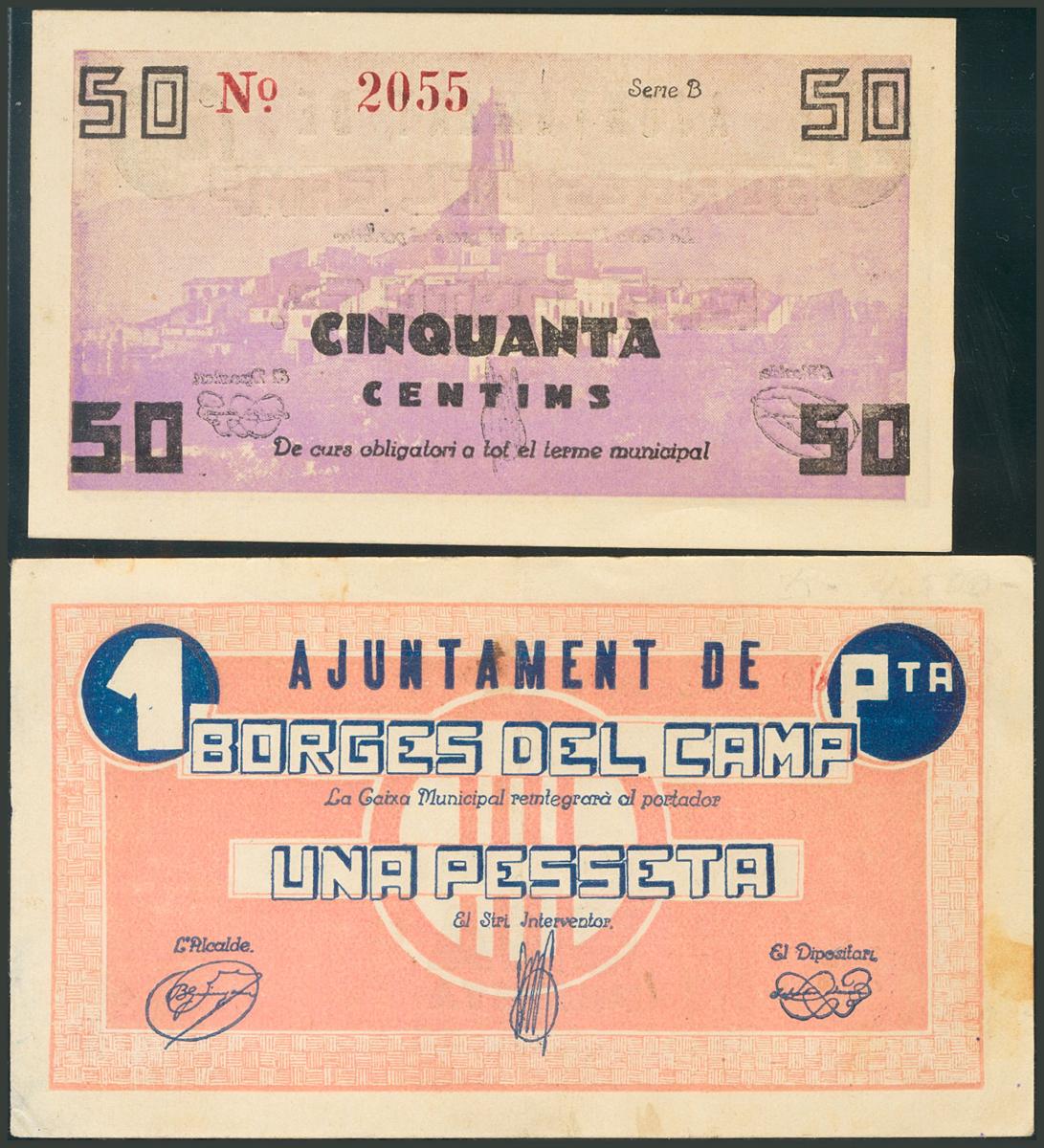 BORGES DEL CAMP (TARRAGONA). 50 Céntimos y 1 Peseta. (1938ca). Series B y A. (González: 7164/65). EBC-.