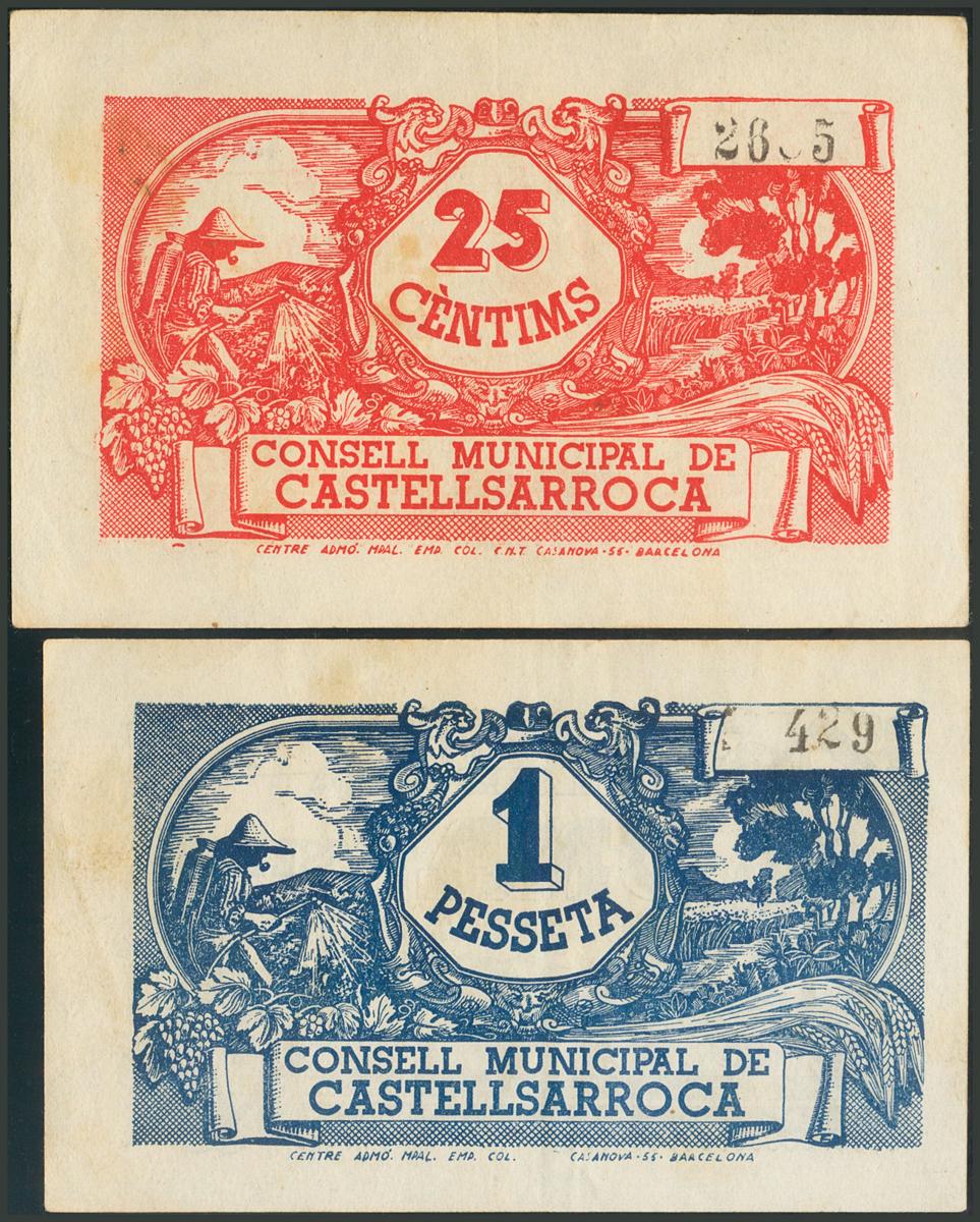 CASTELLSARROCA (TARRAGONA). 25 Céntimos y 1 Peseta. (1938ca). (González: 7503/04). MBC.