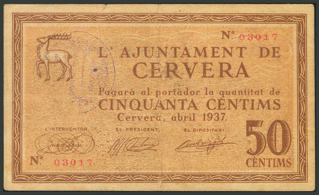 CERVERA (LERIDA). 50 céntimos. Abril de 1937. (González: 7556). MBC.