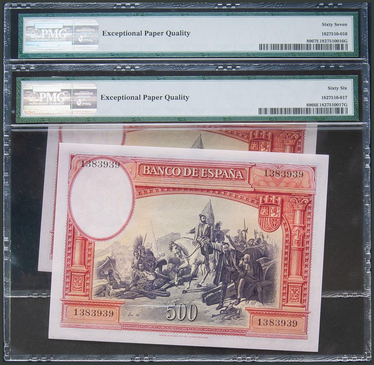 500 Pesetas. 7 de Enero de 1935. Pareja correlativa. Sin serie. (Edifil 2017: 365). Plancha y apresto original. Inusual así. SC. Encapsulado PMG66EQP/67EPQ.