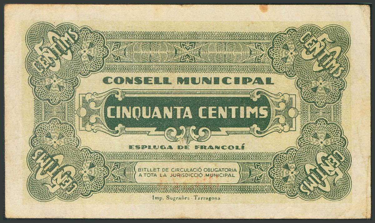 ESPLUGA DE FRANCOLI (TARRAGONA). 50 Céntimos. 14 de Mayo de 1937. (González: 7772). MBC.