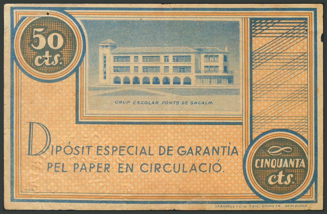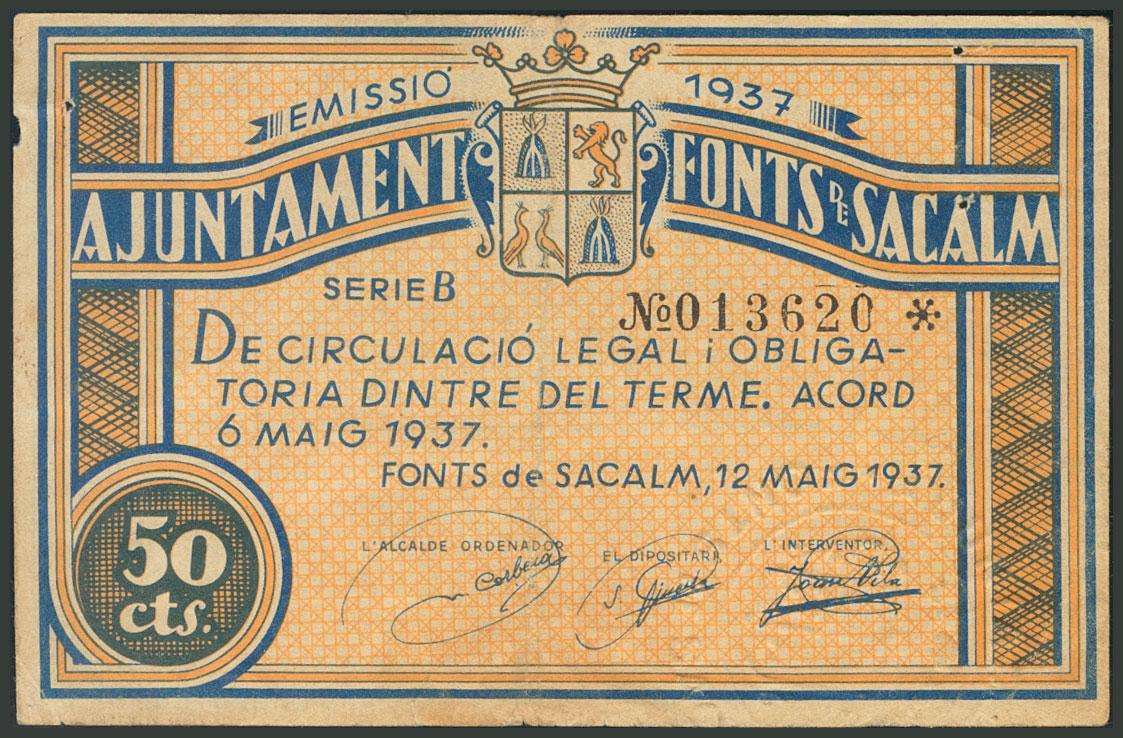 FONTS DE SACALM (GERONA). 50 Céntimos. 12 de Mayo de 1937. Serie B. (González: 7913). BC.