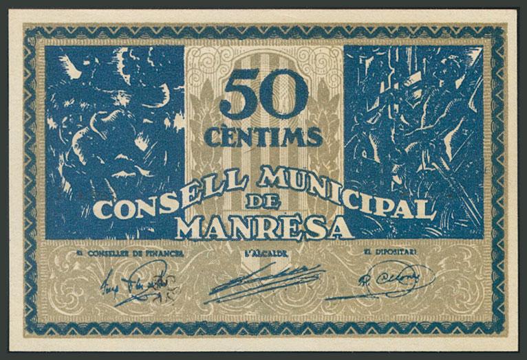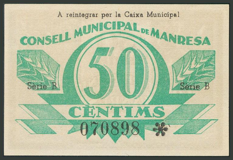 MANRESA (BARCELONA). 50 Céntimos. (1938ca). Serie B. (González: 8494). SC.