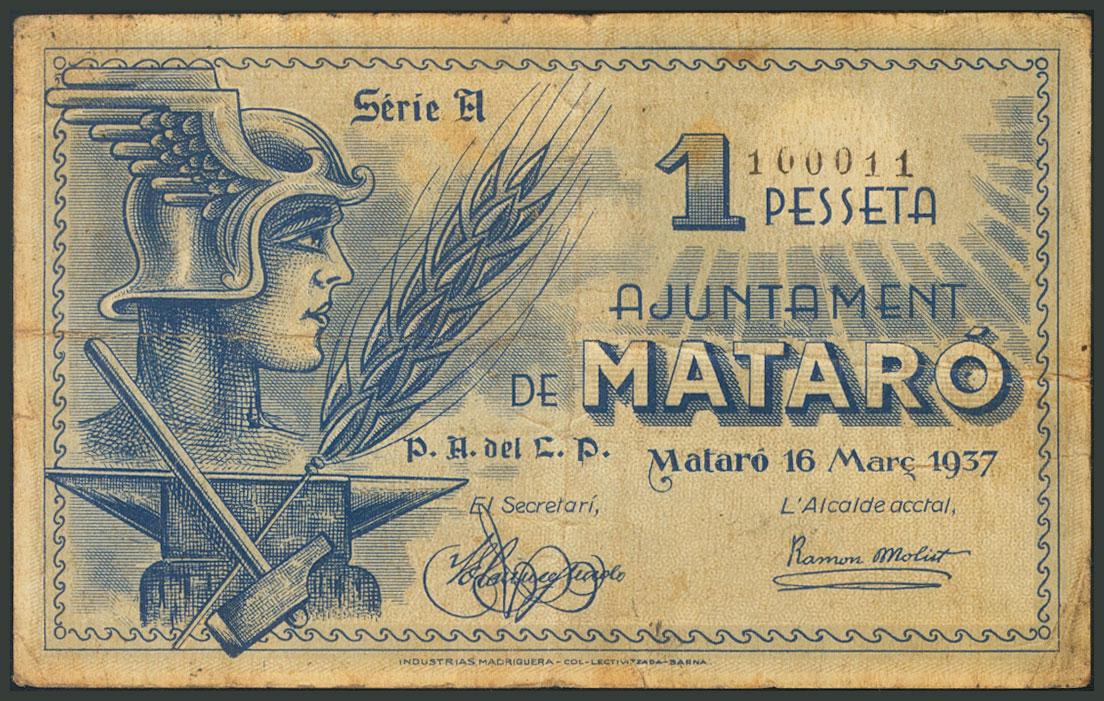 MATARO (BARCELONA). 1 Peseta. 16 de Marzo de 1937. Serie A. (González: 8659). MBC-.