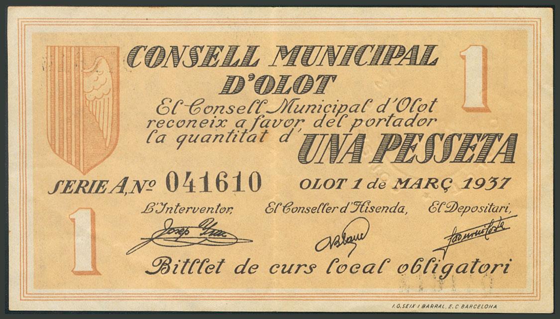 OLOT (GERONA). 1 Peseta. 1 de Marzo de 1937. Serie A. (González: 8951). EBC.