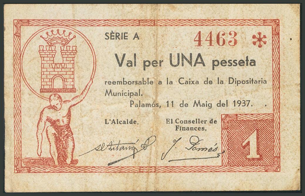 PALAMOS (GERONA). 1 Peseta. 11 de Mayo de 1937. Serie A. (González: 9096). MBC.