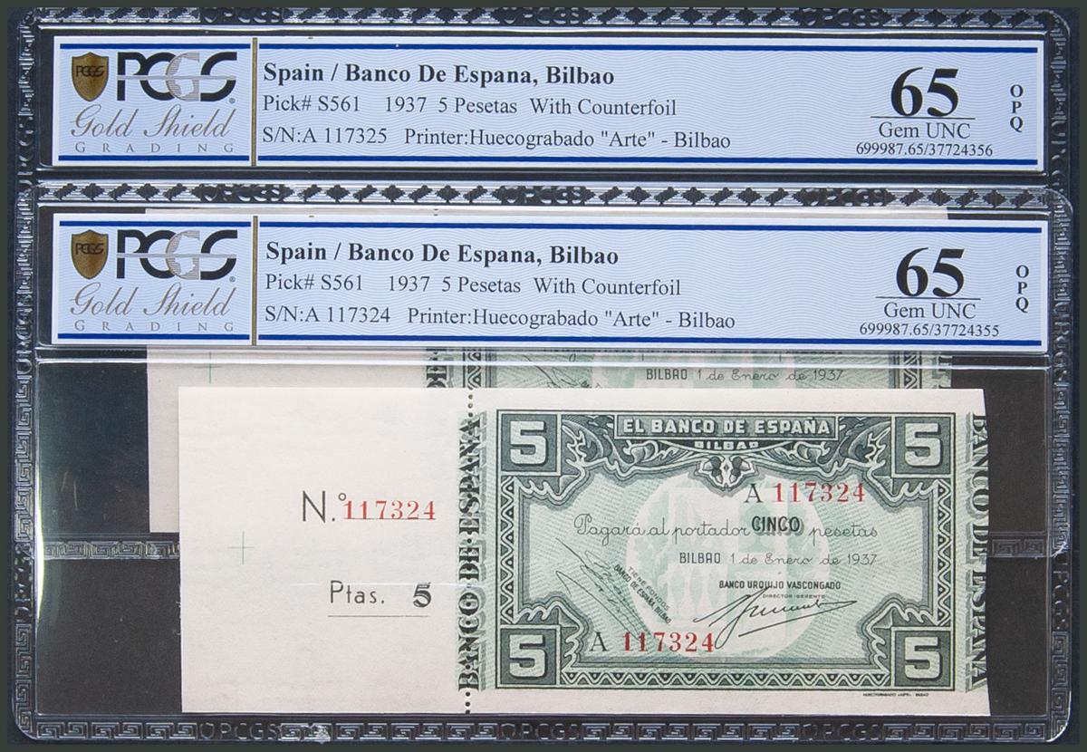 5 Pesetas. 1 de Enero de 1937. Pareja correlativa. Antefirma Banco Urquijo Vascongado y con matriz a izquierda. Sin serie. (Edifil 2017: 387f, Pick: s561). Apresto original. SC. Encapsulado PCGS66OPQ, para ambos billetes (altísima graduación).