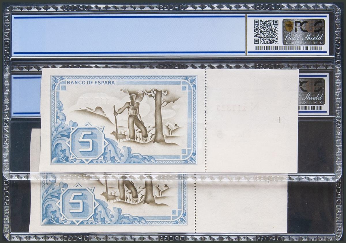 5 Pesetas. 1 de Enero de 1937. Pareja correlativa. Antefirma Banco Urquijo Vascongado y con matriz a izquierda. Sin serie. (Edifil 2017: 387f, Pick: s561). Apresto original. SC. Encapsulado PCGS66OPQ, para ambos billetes (altísima graduación).