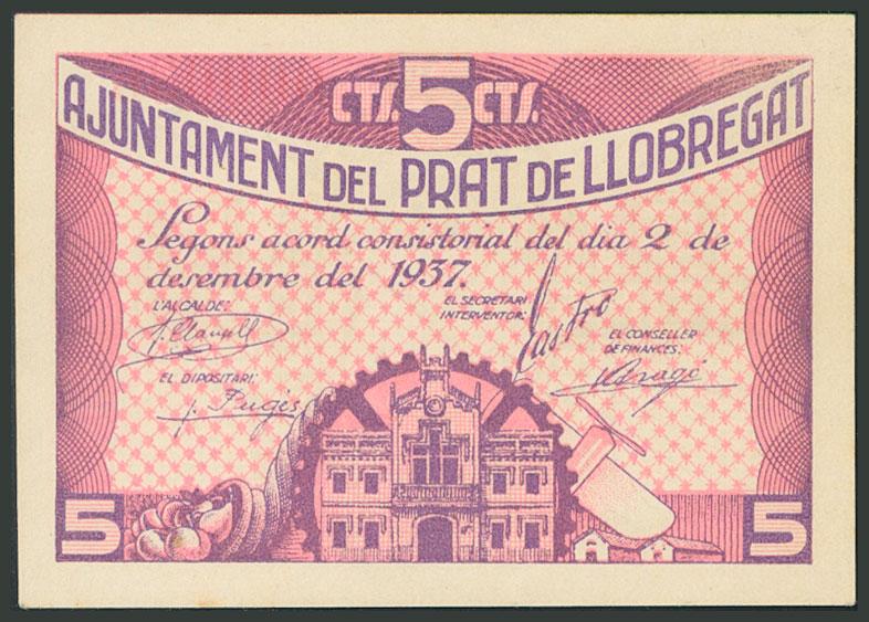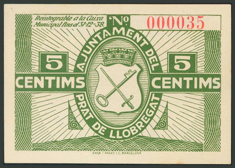 PRAT DE LLOBREGAT (BARCELONA). 5 Céntimos. 2 de Diciembre de 1937. (González: 9430). SC.