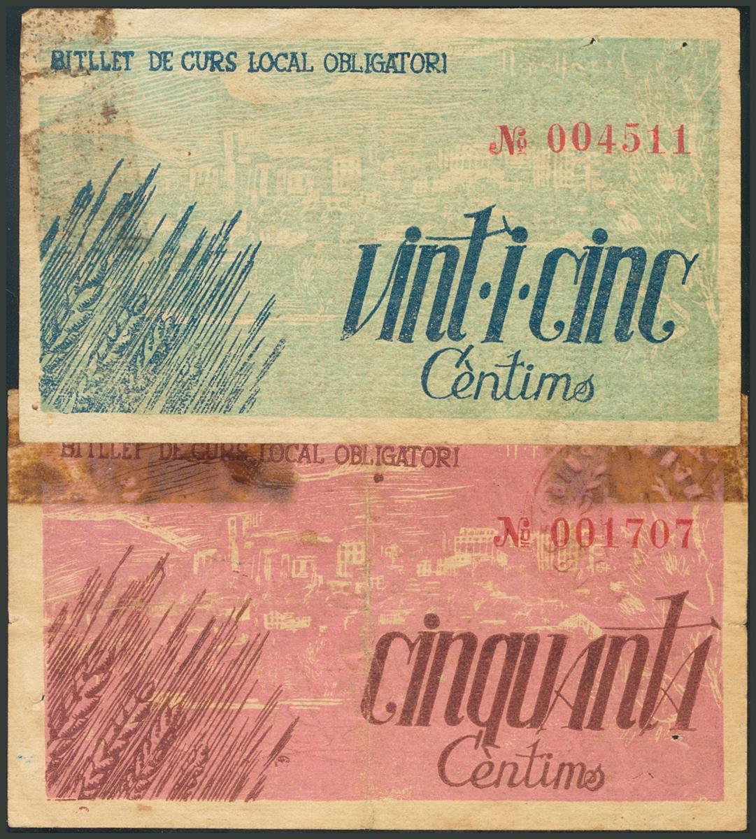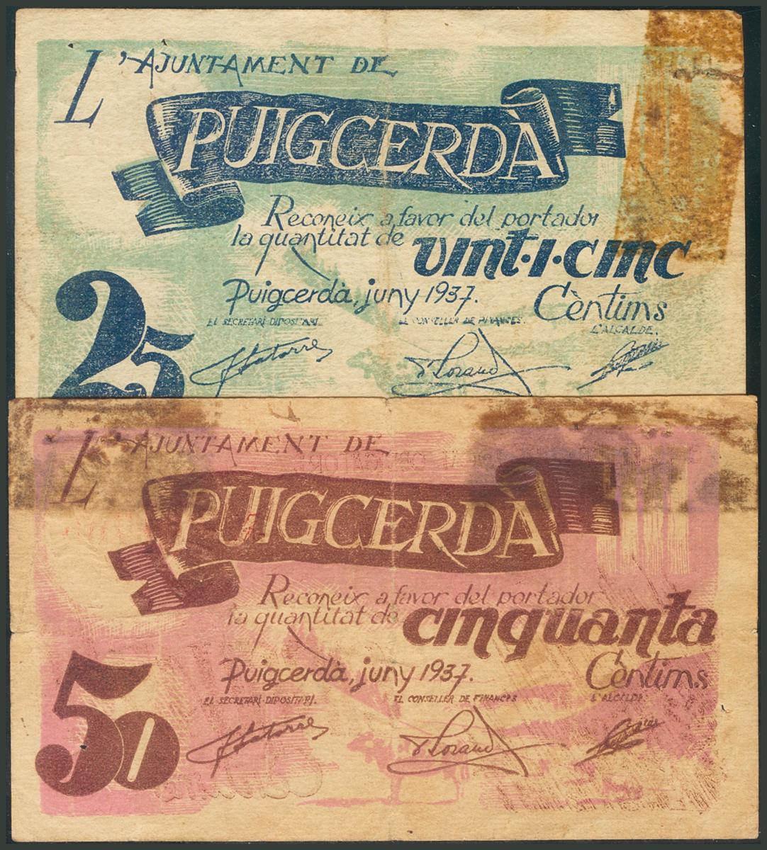 PUIGCERDA (GERONA). 25 Céntimos y 50 Céntimos. Junio 1937. (González: 9486/87). Ambos con marca de cinta adhesiva. RC.