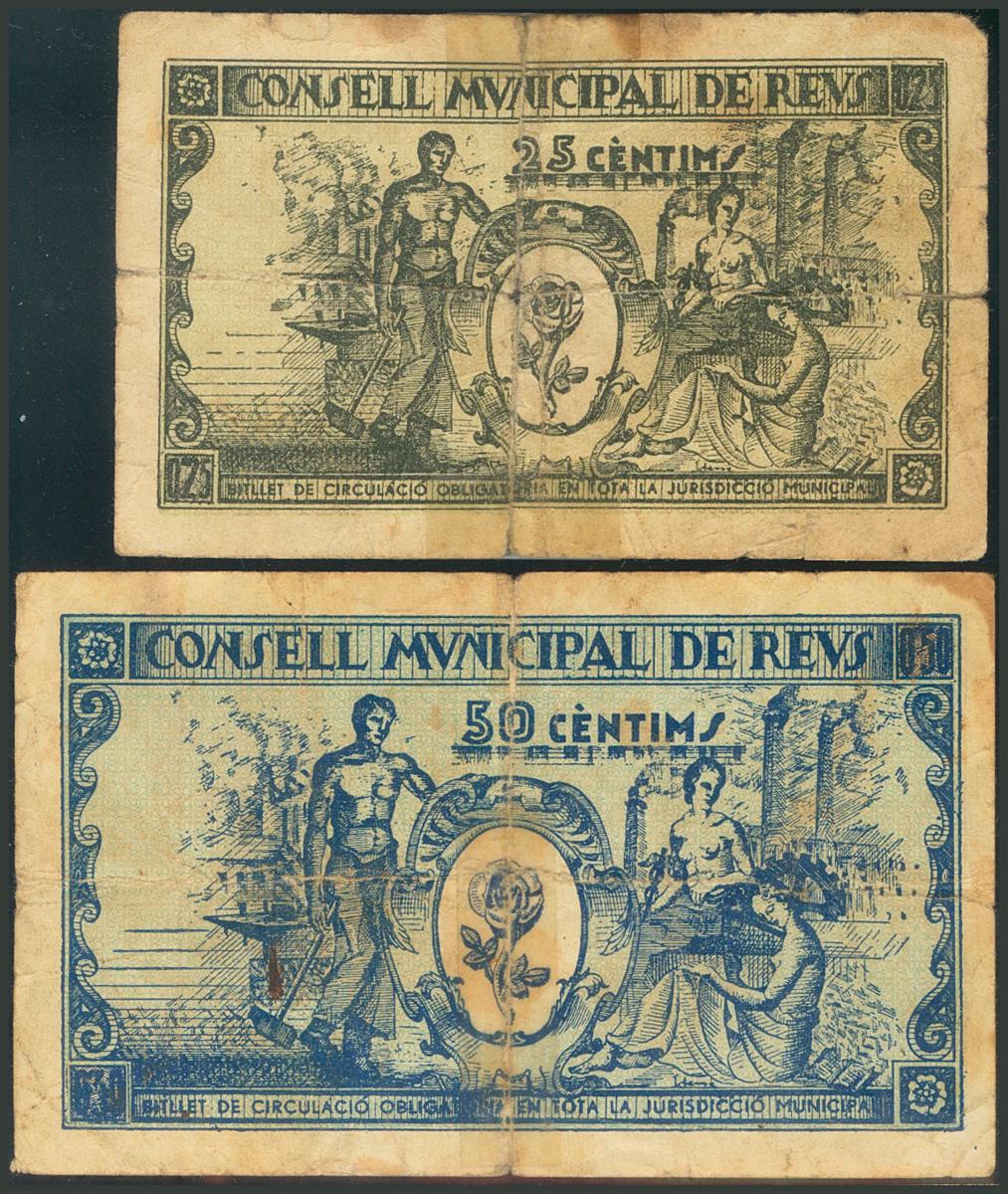 REUS (TARRAGONA). 25 Céntimos y 50 Céntimos. 14 de Abril de 1937. Series E y F, respectivamente. (González: 9552, 9559). RC.