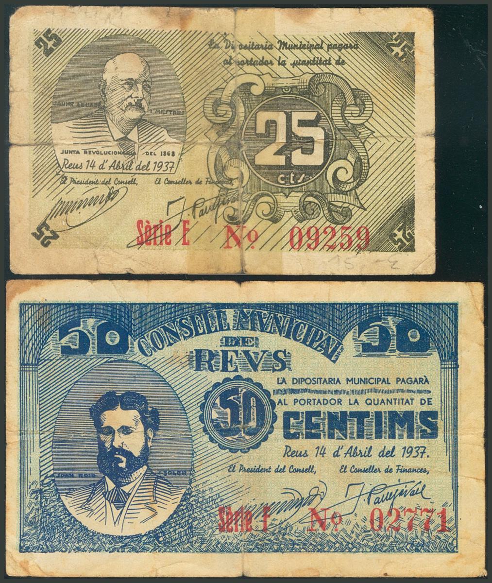 REUS (TARRAGONA). 25 Céntimos y 50 Céntimos. 14 de Abril de 1937. Series E y F, respectivamente. (González: 9552, 9559). RC.