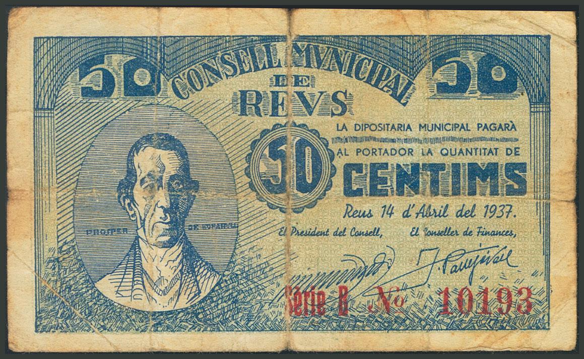 REUS (TARRAGONA). 50 Céntimos. 14 de Abril de 1937. Serie B. (González: 9555). RC.