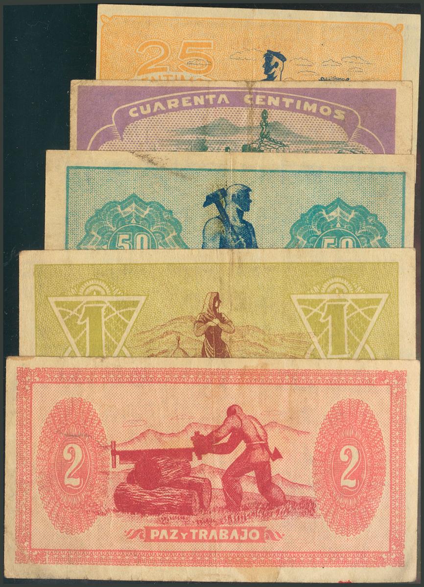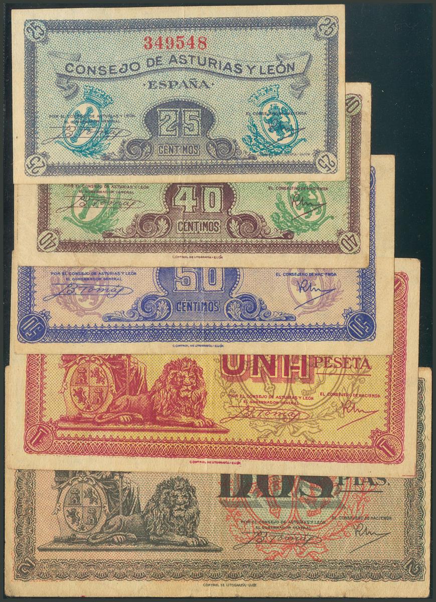 Conjunto completo de los billetes emitidos por el Consejo de Asturias y León, correspondientes a los valores de 25 Céntimos, 40 Céntimos, 50 Céntimos, 1 Peseta y 2 Pesetas, emitidos en el año 1937 y todos ellos sin serie (Edifil 2017: 394/98). MBC.