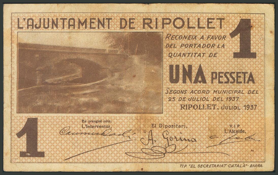 RIPOLLET (BARCELONA). 1 Peseta. 25 de Julio de 1937. (González: 9668). MBC.