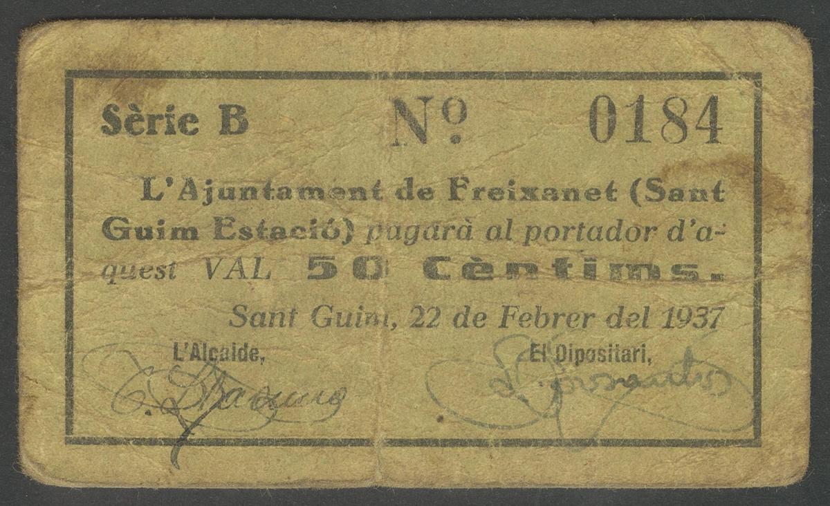 OLOT (GERONA). 50 Céntimos emitido el 23 de Junio de 1937 y 1 Peseta emitido el 1 de Marzo de 1937. Serie A, ambos. (González: 8951, 8953). RC.