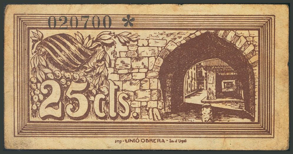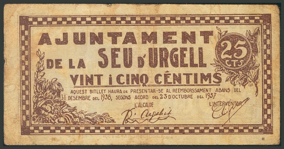 SEU DE URGELL (LERIDA). 25 Céntimos. 30 de Junio de 1937. (González: 10000). MBC.