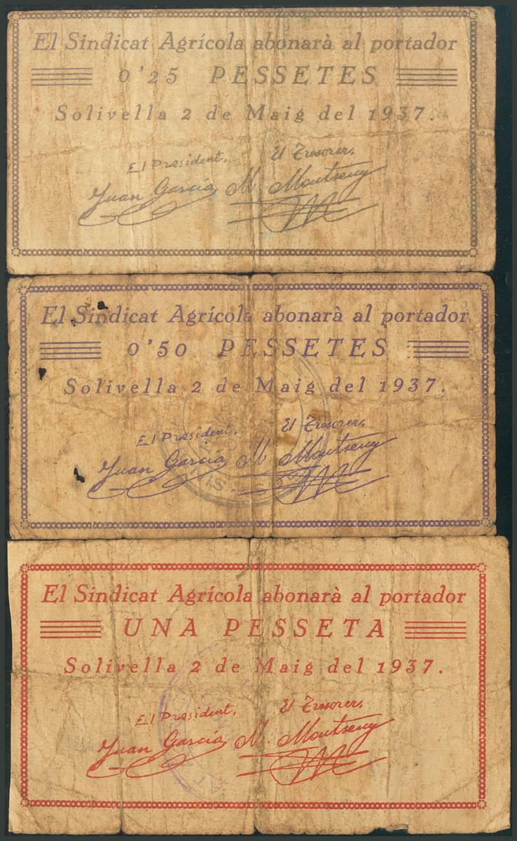 SOLIVELLA (TARRAGONA). 0´25 Pesetas, 0´50 Pesetas y 1 Peseta. 2 de Mayo de 1937. (González: 10025/27). Inusual. RC.
