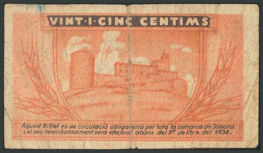 SOLSONA (LERIDA). 25 Céntimos. 1 de Diciembre de 1937. Serie A. (González: 10040). RC.