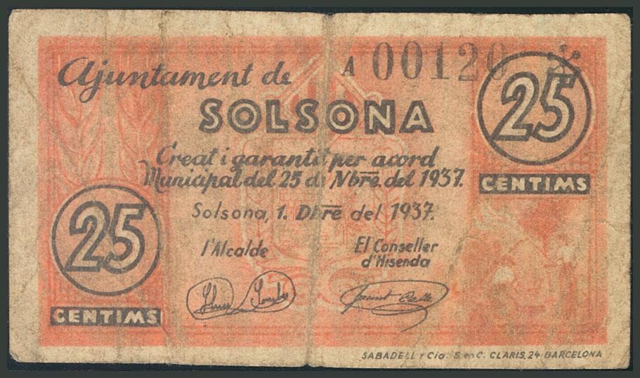 SOLSONA (LERIDA). 25 Céntimos. 1 de Diciembre de 1937. Serie A. (González: 10040). RC.
