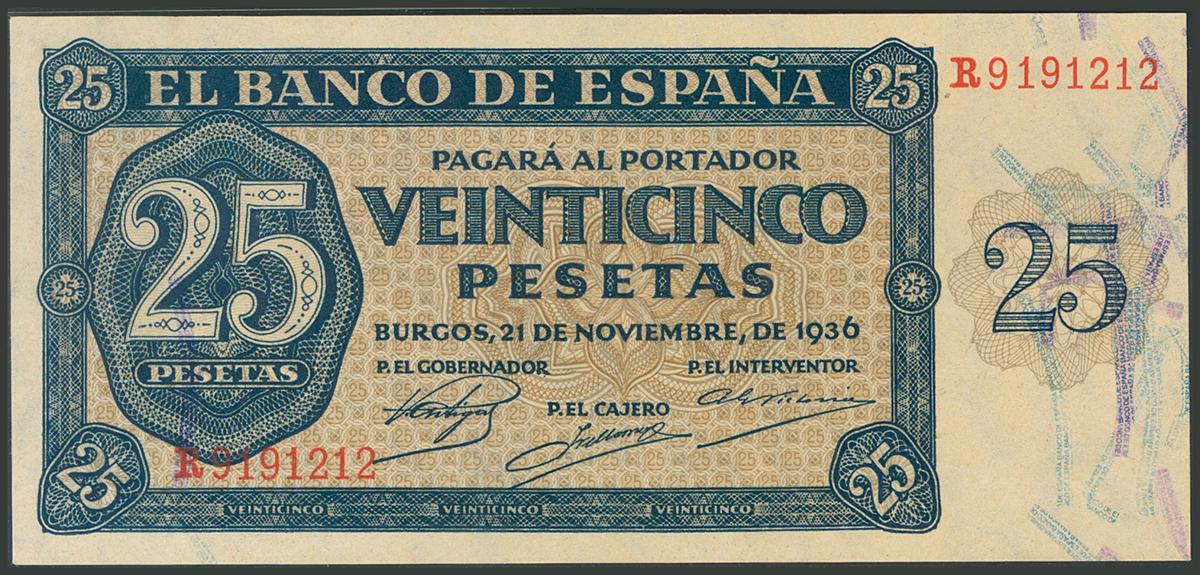 25 Pesetas. 21 de Noviembre de 1936. Serie R. (Edifil 2017: 419a). SC.