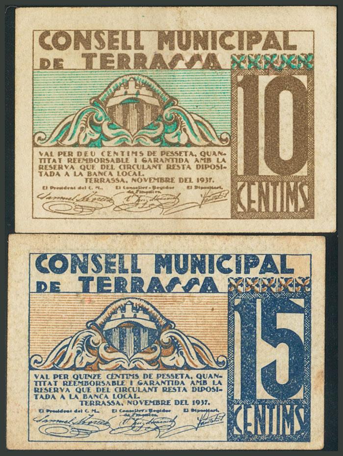 TERRASSA (BARCELONA). 10 Céntimos y 15 Céntimos. 15 de Noviembre de 1937. (González: 10134/35). MBC.