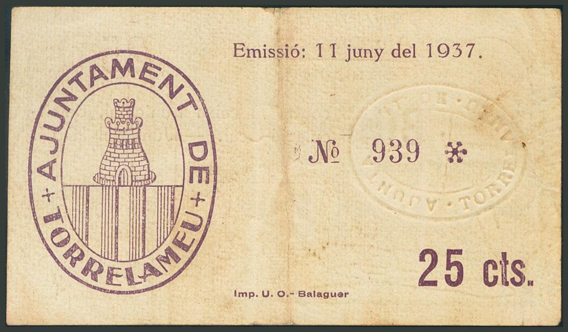 TORRELAMEU (LERIDA). 25 Céntimos. 11 de Junio de 1937. (González: 10365). MBC.