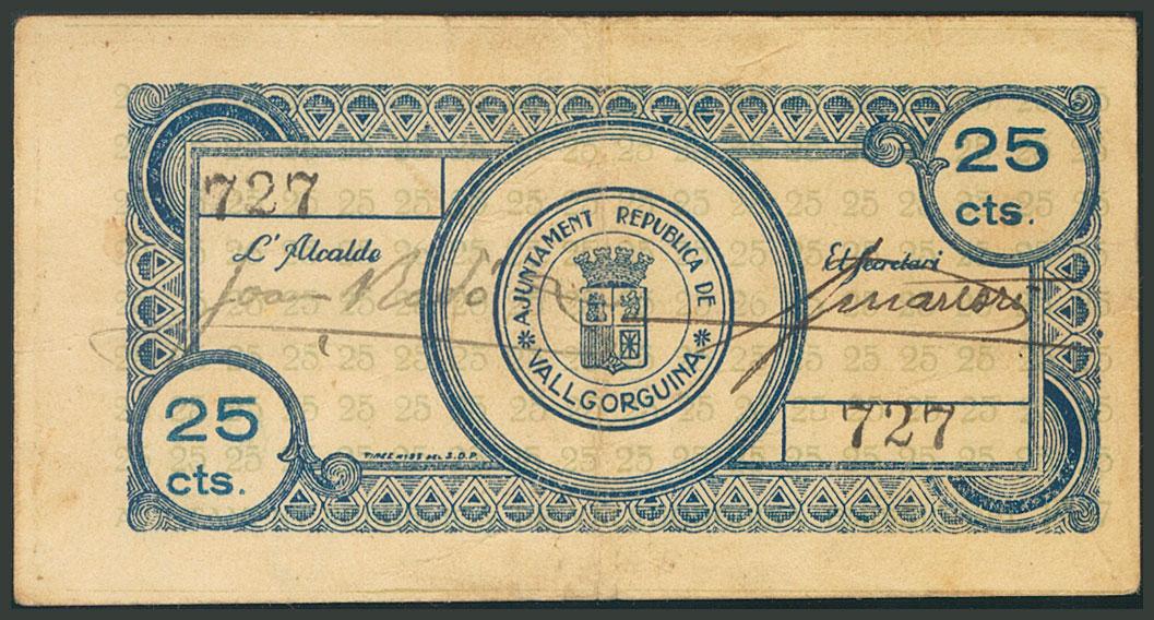 VALLGORGUINA (BARCELONA). 25 Céntimos. (1938ca). (González: 10527). MBC.
