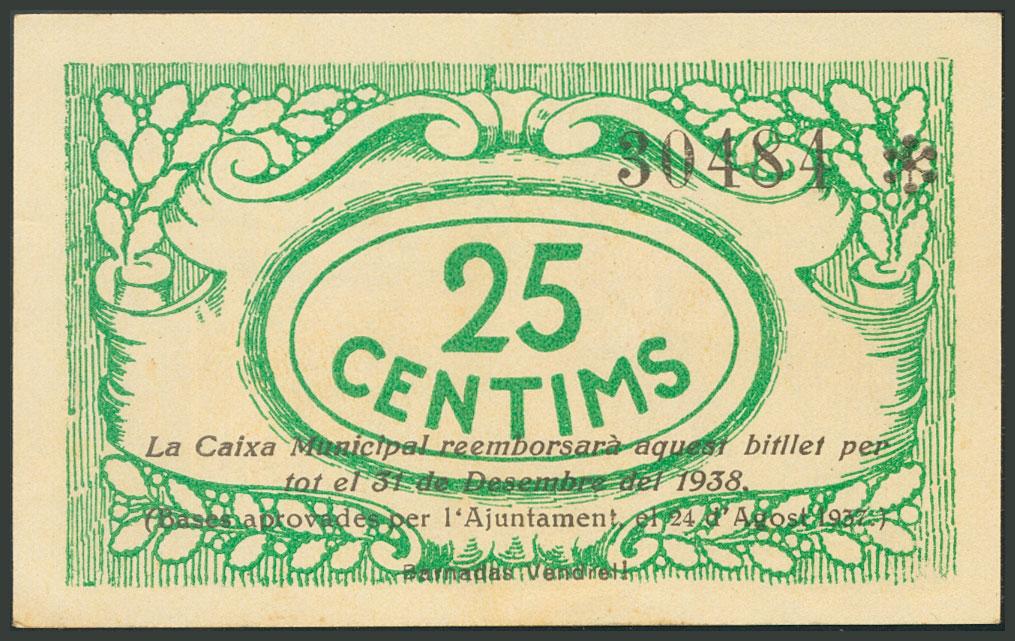 VENDRELL (TARRAGONA). 25 Céntimos. Agosto 1937. (González: 10599). EBC.