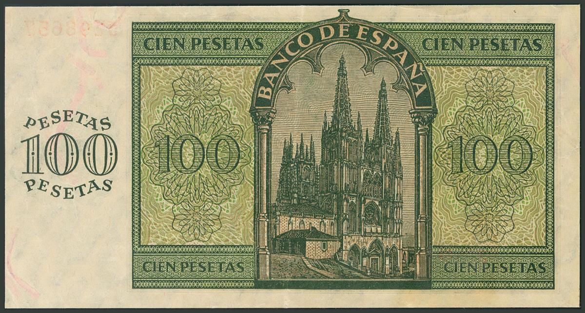 100 Pesetas. 21 de Noviembre de 1936. Serie J. Doblez vertical. (Edifil 2017: 421a). Conserva gran parte del apresto original. EBC.