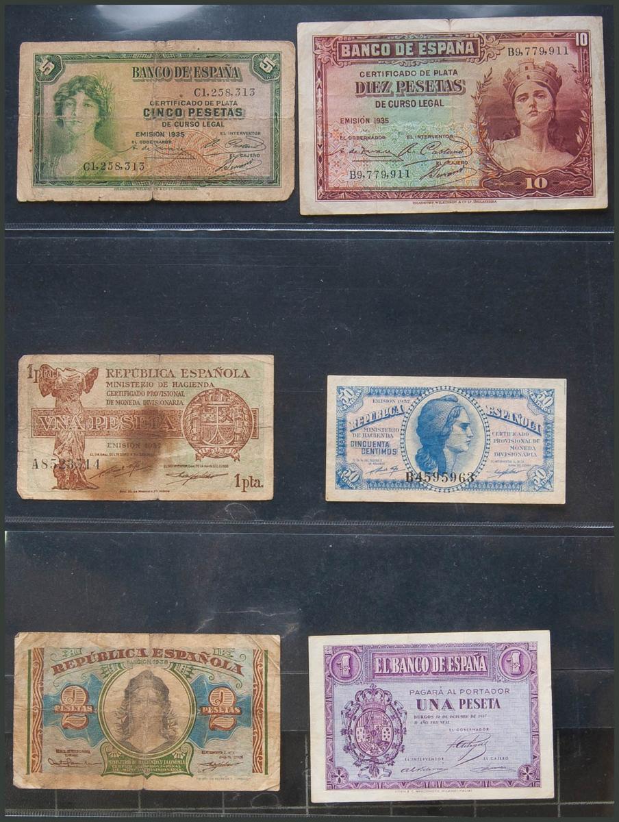 Espectacular conjunto de billetes en su mayoría del Estado Español en diversas cantidades y calidades, alguno de ellos con numeraciones correlativas, con presencia de muchos valores con denominaciones altas, un conjunto verdaderamente comercial. REQUIERE UN DETENIDO E IMPRESCINDIBLE EXAMEN.