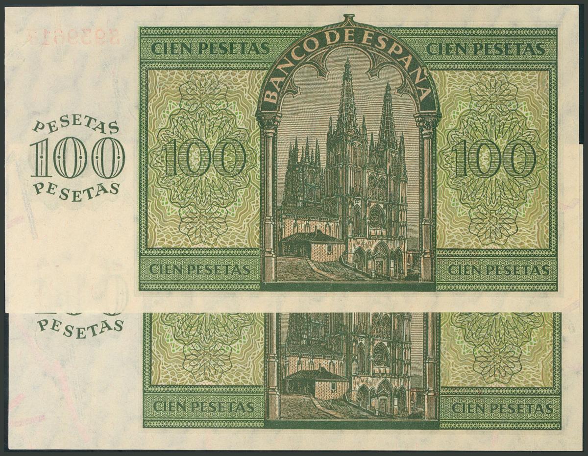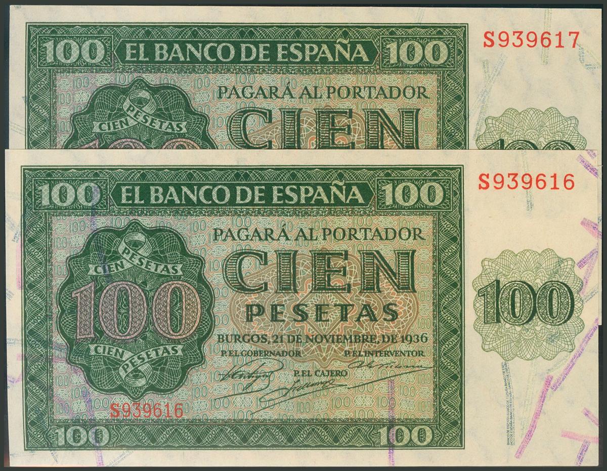 100 Pesetas. 21 de Noviembre de 1936. Pareja correlativa. Serie S. (Edifil 2017: 421a). Apresto original. Inusual en esta excepcional calidad. SC.