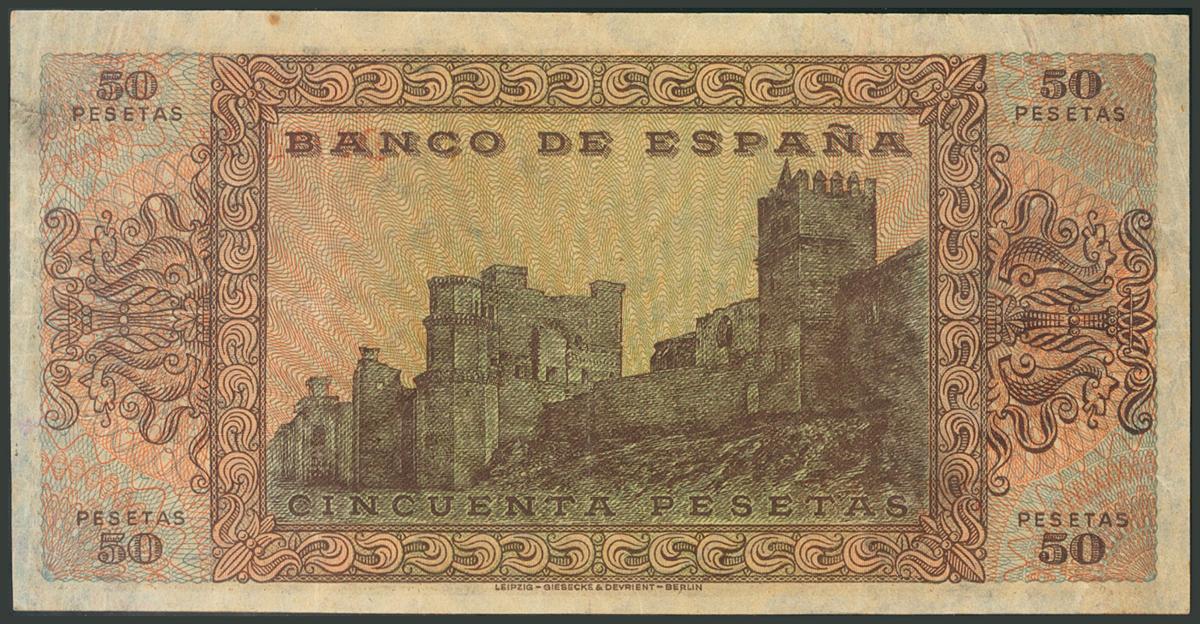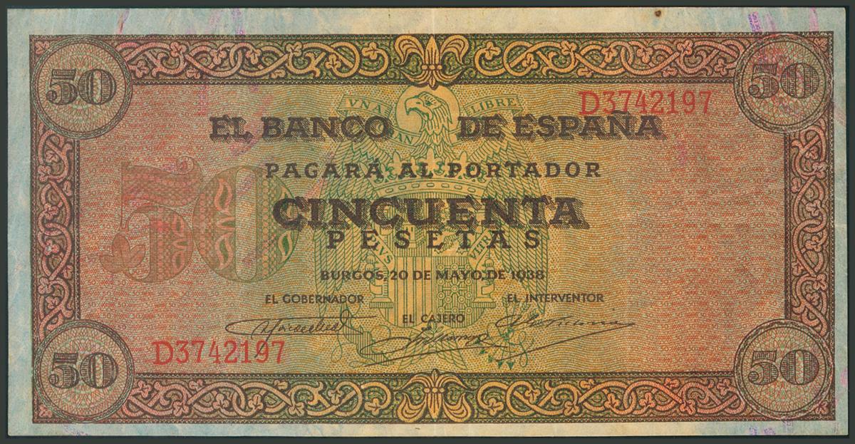 50 Pesetas. 20 de Mayo de 1938. Serie D. (Edifil 2017: 431a). MBC+.