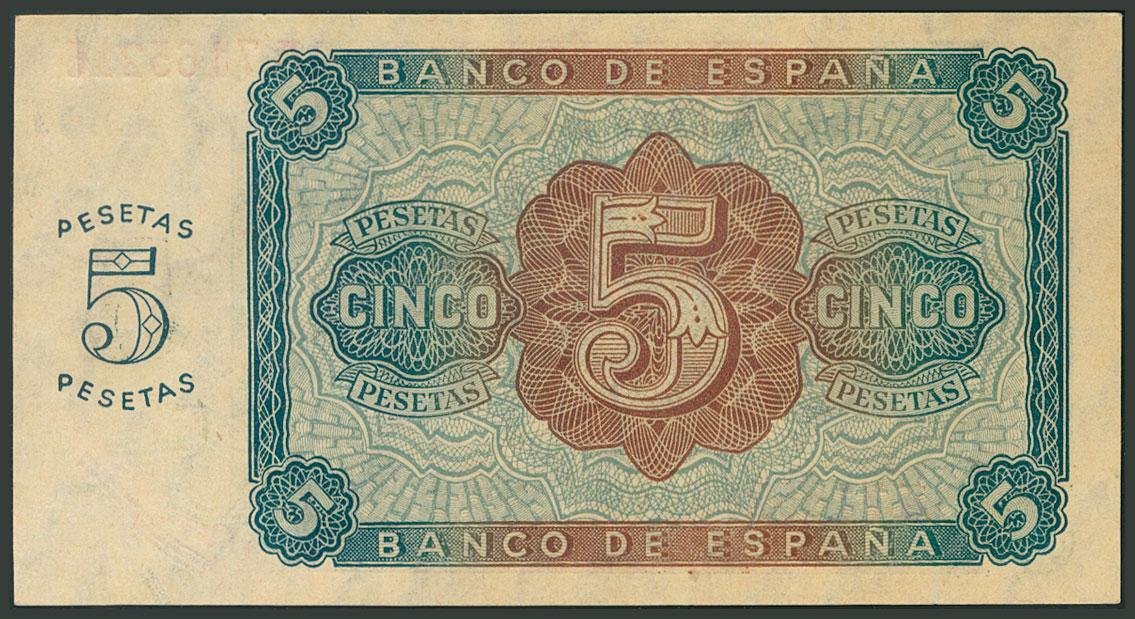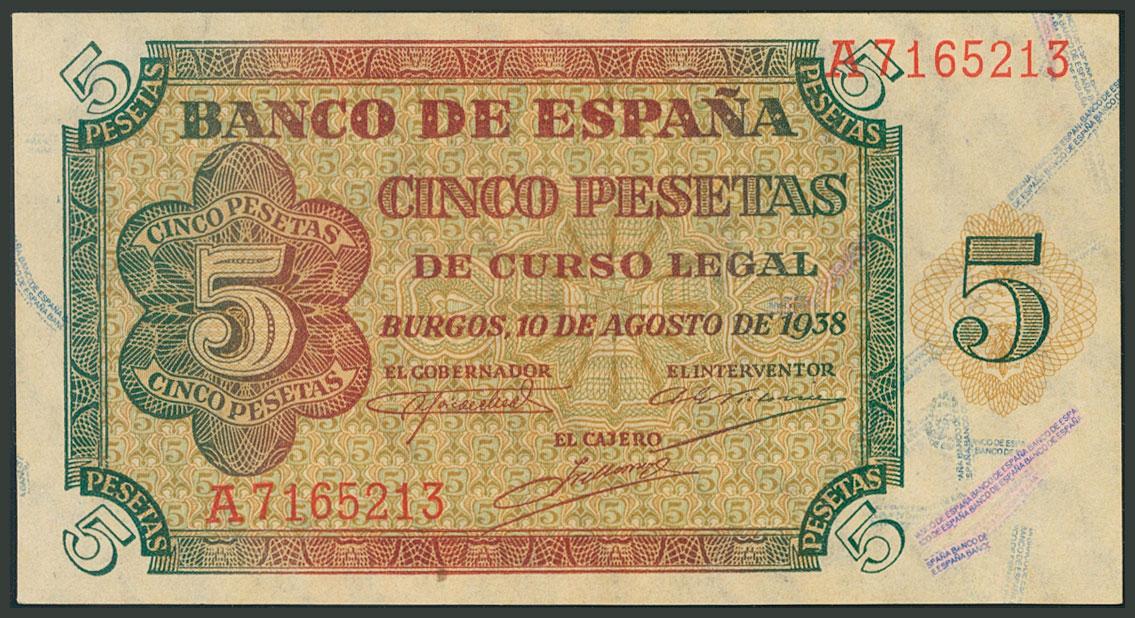5 Pesetas. 10 de Agosto de 1938. Serie A. (Edifil 2017: 435a). Apresto original. SC.