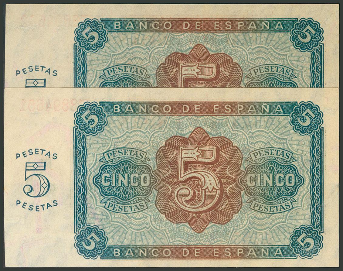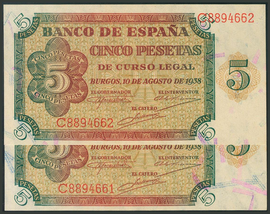 5 Pesetas. 10 de Agosto de 1938. Pareja correlativa. Serie C. (Edifil 2017: 435a). Apresto original. SC.