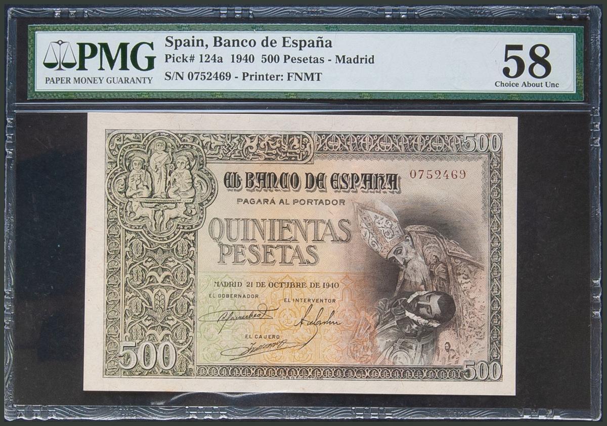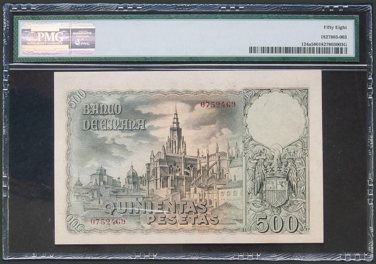 500 Pesetas. 21 de Octubre de 1940. Sin serie. (Edifil 2017: 444). EBC+. Encapsulado PMG58 (a fecha del 17/10/2019 sólo seis billetes han sido certificados con calidad superior).