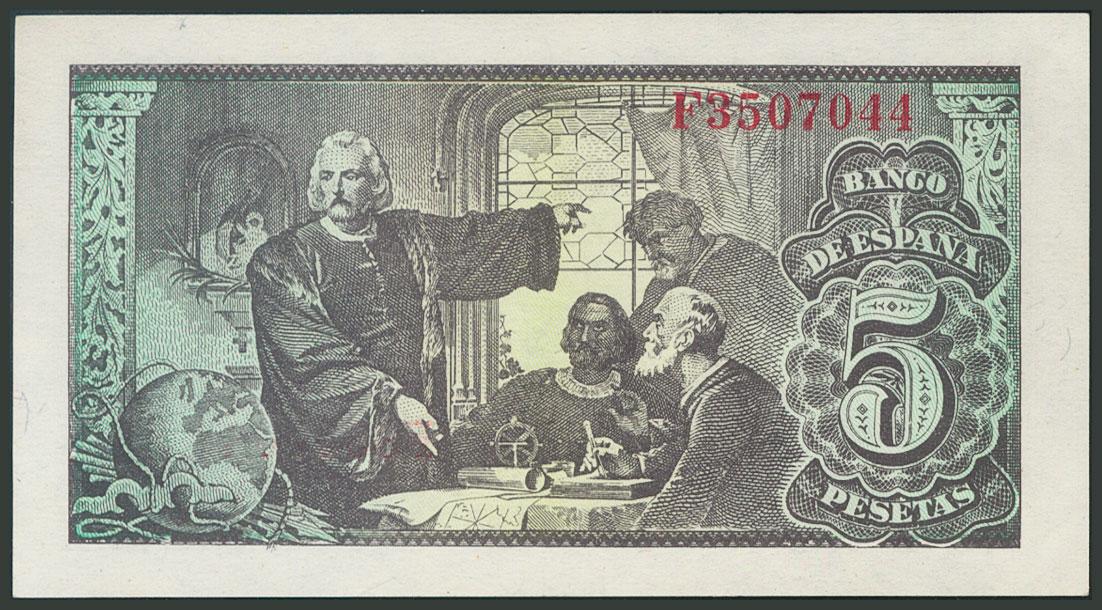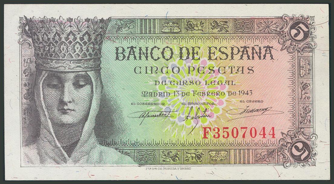 5 Pesetas. 13 de Febrero de 1943. Serie F. (Edifil 2017: 446a). Apresto original. SC-.