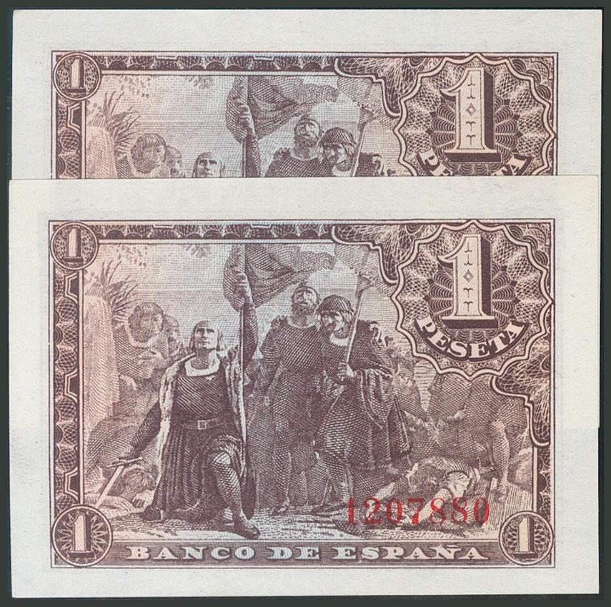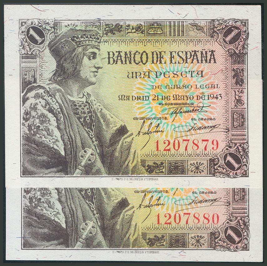 1 Peseta. 21 de Mayo de 1943. Pareja correlativa. Sin serie. (Edifil 2017: 447). Apresto original. SC.