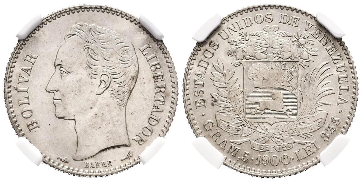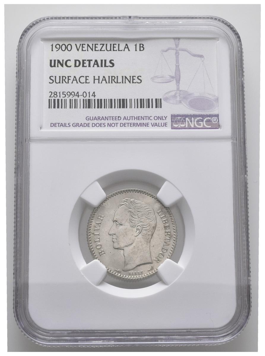 ESTADOS UNIDOS DE VENEZUELA. 1 Bolívar. (Ar. 5,00g/23mm). 1900. (Km#Y22). Encapsulado NGC UNC Details. Rayitas.