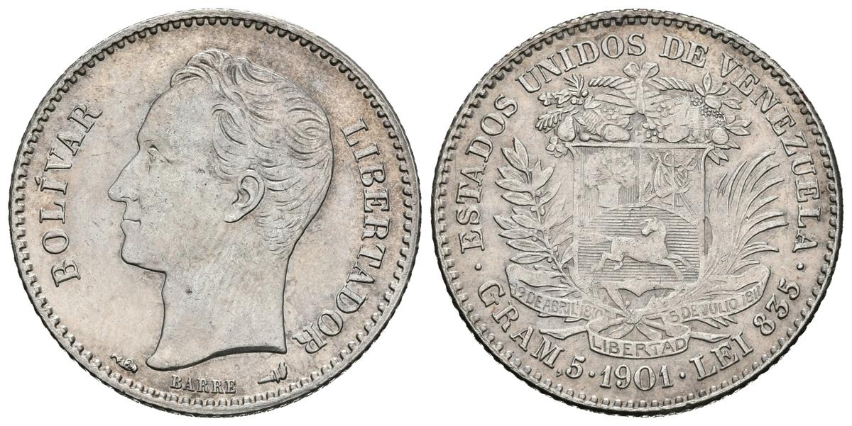 ESTADOS UNIDOS DE VENEZUELA. 1 Bolívar. (Ar. 5,00g/23mm). 1901. París. (Km#Y22). MBC+.
