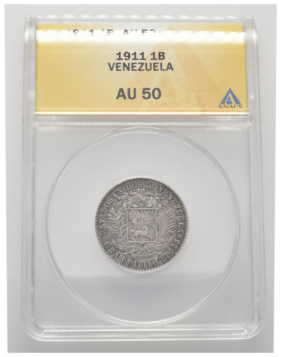ESTADOS UNIDOS DE VENEZUELA. 1 Bolívar. (Ar. 5,00g/23mm). 1911. Philadelphia. (Km#Y22). Encapsulado ANACS AU-50.
