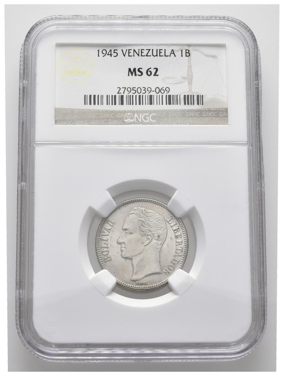ESTADOS UNIDOS DE VENEZUELA. 1 Bolívar. (Ar. 5,00g/23mm). 1945. Philadelphia. (Km#Y22a). Encapsulado NGC MS-62.