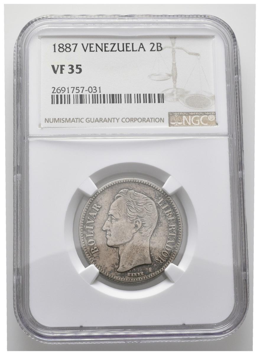 ESTADOS UNIDOS DE VENEZUELA. 2 Bolívares. (Ar. 10,00g/27mm). 1887. Caracas. (Km#23). Encapsulado NGC VF-35.