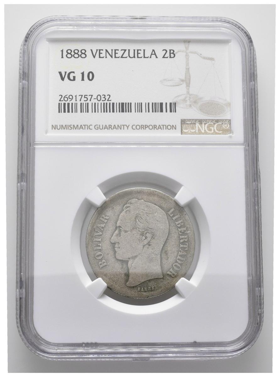 ESTADOS UNIDOS DE VENEZUELA. 2 Bolívares. (Ar. 10,00g/27mm). 1888. Caracas. (Km#23). Encapsulado NGC VG-10.